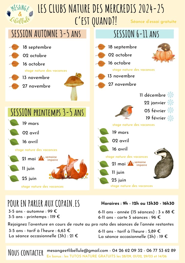 QUAND ? : 1 mercredi sur 2 de 9h-12h ou de 13h30 à 16h30 pour une session d’automne et une de printemps, (mi-septembre à fin novembre et de mars à juin), excluant les jours fériés et les vacances scolaires car c’est les stages nature à la semaine !