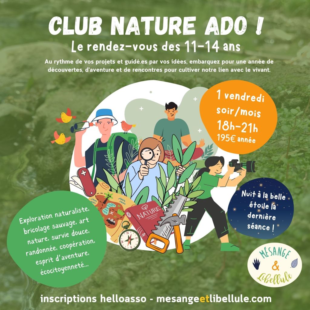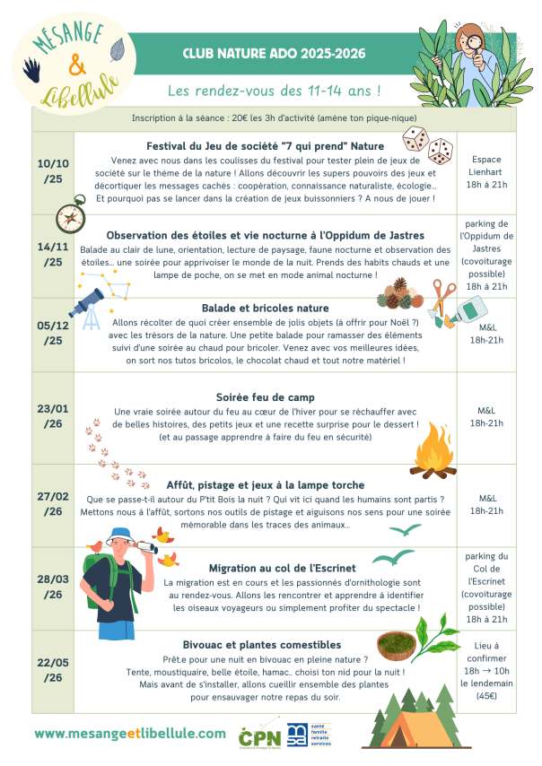 Embarquez pour une année de pleine de découvertes, d’aventure et de rencontres 🍃 pour cultiver notre lien avec le dehors et le vivant. Chaque mois ou presque, au P’tit Bois de St Sernin ou en expédition, venez nous retrouver pour vivre des aventures nature au fil des saisons.
